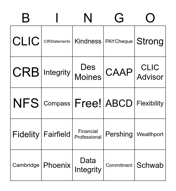 This bingo card has a free space and 24 words: Fairfield, Phoenix, Des Moines, Cambridge, Strong, CLIC, CRB, CIRStatements, ABCD, Financial Professional, CAAP, NFS, Pershing, Wealthport, Integrity, Commitment, Flexibility, Kindness, CLIC Advisor, Compass, Schwab, Fidelity, PAYCheque and Data Integrity.
