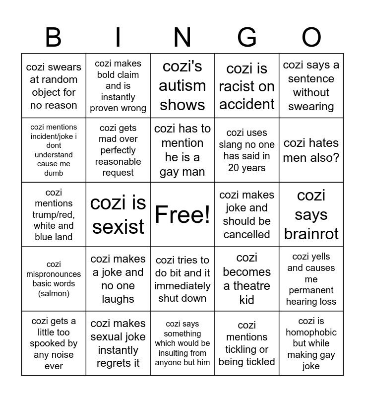 This bingo card has a free space and 24 words: cozi makes a joke and no one laughs, cozi makes sexual joke instantly regrets it, cozi has to mention he is a gay man, cozi gets a little too spooked by any noise ever, cozi says a sentence without swearing, cozi swears at random object for no reason, cozi mentions incident/joke i dont understand cause me dumb, cozi makes bold claim and is instantly proven wrong, cozi makes joke and should be cancelled, cozi tries to do bit and it immediately shut down, cozi uses slang no one has said in 20 years, cozi mentions trump/red, white and blue land, cozi becomes a theatre kid, cozi yells and causes me permanent hearing loss, cozi gets mad over perfectly reasonable request, cozi mentions tickling or being tickled, cozi says brainrot, cozi's autism shows, cozi hates men also?, cozi is sexist, cozi is homophobic but while making gay joke, cozi mispronounces basic words (salmon), cozi is racist on accident and cozi says something which would be insulting from anyone but him.