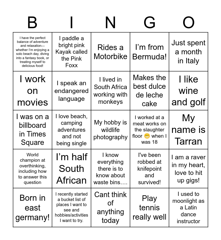 This bingo card has 80 words: Headchef and really fit, Really likes bikes, Rides a Motorbike, Has a dog called Wally, I have recently bought an apartment in the city - please ask me about it!!, My sister says I’m an extreme extrovert while she is being an introvert., I once lost a sausage roll eating competition to the Attorney General, I once went on a first date with this girl I met on Tinder and we ended up drinking some beers with her parents, Love any kind of adventure, I can whistle like a train, Got yelled at by Russell Crowe once., My work lunch room are the states national parks, I’m from Bermuda!, I have the perfect balance of adventure and relaxation—whether I’m enjoying a solo beach day, diving into a fantasy book, or treating myself to delicious food!, Can sail, I work on movies, I love portrait photography, I’m half South African, My last name is Chai, like the drink, My name is Tarran, I’m a twin, Just spent a month in Italy, I was on a billboard in Times Square, I lived in South Africa working with monkeys, I speak an endangered language, I’ve driven a dog sled in the arctic circle, Lived in both UK and USA in the last decade, I have two dogs, a groodle and a spoodle, I moved to Australia when I was 14 and English is my second language, I’m trying to travel to 100 countries!, I like wine and golf, I have 3 nationalities, Cant think of anything today, I used to moonlight as a Latin dance instructor, Born in east germany!, I worked at a meat works on the slaughter floor 😬 when I was 18, I absolutely love karaoke, I prefer linguini over spaghetti, I'm artsy and creative, My hobby is wildlife photography, From Darwin loves basketball, From California, loves AFL, my name is Kayla (I didn't write a fun fact), Have recently traveled to Bhutan 🇧🇹, I've hosted a Christmas in July for my friends for 12 years in a row, I paddle a bright pink Kayak called the Pink Foxx, I can't spell witty (I wrote "Whitty" on my form), I play the drums :), I work FIFO in the mines & like content creation., I’m a teacher who’s trying to rediscover life outside of work. I think K-Pop is fun and I’m a homebody who likes to be cosy and read., I am a raver in my heart, love to hit up gigs!, I love beach, camping adventures and not being single, I've been robbed at knifepoint and survived!, I drive a sparkly pink van covered in rainbows, Friendly, I’m a sucker for exotic foods, I can do the voice of the google maps lady really well, I'm building my own dinner table, Just a normal guy with most expensive hobbies, I know everything there is to know about waste bins…., Makes the best dulce de leche cake, Up for food exploration anytime, Down for impromptu activities at any given time, Traveller, I’m actually 31!! Hahah🤣, I’m a mum of 2 & photographer who loves to coffee, margaritas and to dance, Born in Ireland, and a twin, My dog almost died from a bee sting, I volunteer my time at a kite festival each year, Risked my life to see green sand beach in Hawaii, World champion at overthinking, including how to answer this question, I recently started a bucket list of places I want to see and hobbies/activities I want to try., I lived in Edinburgh & London, I have lived in Japan., I'm a big fan of Vegemite, Funny and able to do hiphop, Play tennis really well, Love dogs, am a fitness instructor and loves outdoor, My name is Elva and My name is Annie.