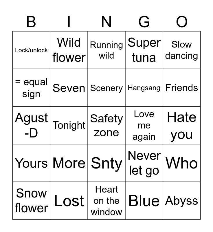This bingo card has a free space and 24 words: More, Lost, Scenery, Snow flower, Slow dancing, Lock/unlock, = equal sign, Wild flower, Love me again, Snty, Hangsang, Agust -D, Never let go, Who, Seven, Blue, Hate you, Running wild, Friends, Tonight, Abyss, Yours, Super tuna and Heart on the window.
