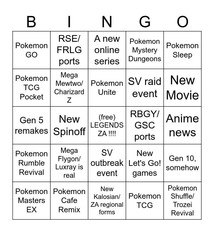 This bingo card has a free space and 24 words: Mega Flygon/ Luxray is real, Pokemon Cafe Remix, Pokemon Unite, Pokemon Masters EX, Pokemon Sleep, Pokemon GO, Pokemon TCG Pocket, RSE/ FRLG ports, RBGY/ GSC ports, SV outbreak event, SV raid event, Gen 5 remakes, New Let's Go! games, Gen 10, somehow, Mega Mewtwo/ Charizard Z, Pokemon TCG, Anime news, A new online series, New Movie, New Spinoff, Pokemon Shuffle/ Trozei Revival, Pokemon Rumble Revival, Pokemon Mystery Dungeons and New Kalosian/ ZA regional forms.