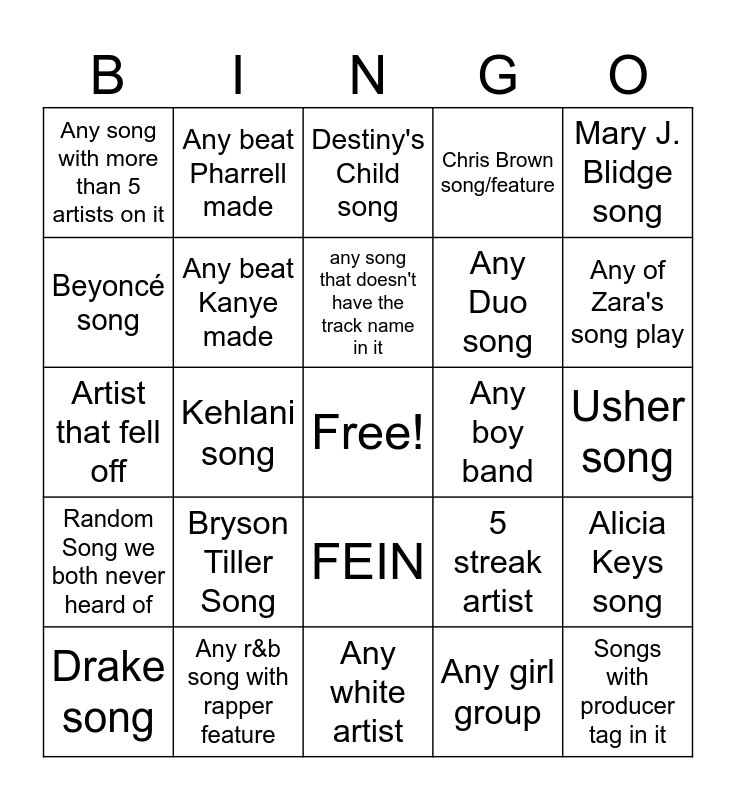 This bingo card has a free space and 24 words: Bryson Tiller Song, Any r&b song with rapper feature, any song that doesn't have the track name in it, Drake song, Mary J. Blidge song, Any song with more than 5 artists on it, Beyoncé song, Any beat Pharrell made, Any boy band, FEIN, Any Duo song, Artist that fell off, 5 streak artist, Alicia Keys song, Any beat Kanye made, Any girl group, Usher song, Destiny's Child song, Any of Zara's song play, Kehlani song, Songs with producer tag in it, Random Song we both never heard of, Chris Brown song/feature and Any white artist.