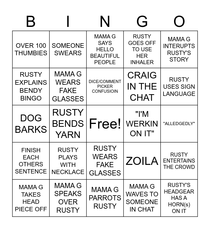 This bingo card has a free space and 25 words: RUSTY PLAYS WITH NECKLACE, MAMA G PARROTS RUSTY, DICE/COMMENT PICKER CONFUSIOIN, MAMA G TAKES HEAD PIECE OFF, MAMA G INTERUPTS RUSTY'S STORY, OVER 100 THUMBIES, RUSTY EXPLAINS BENDY BINGO, SOMEONE SWEARS, "I'M WERKIN ON IT", RUSTY WEARS FAKE GLASSES, CRAIG IN THE CHAT, DOG BARKS, ZOILA, RUSTY ENTERTAINS THE CROWD, MAMA G WEARS FAKE GLASSES, MAMA G VAPES OFF SCREEN, "ALLEDGEDLY", MAMA G SAYS HELLO BEAUTIFUL PEOPLE, RUSTY USES SIGN LANGUAGE, RUSTY BENDS YARN, RUSTY'S HEADGEAR HAS A HORN(s) ON IT, MAMA G SPEAKS OVER RUSTY, FINISH EACH OTHERS SENTENCE, RUSTY GOES OFF TO USE HER INHALER and MAMA G WAVES TO SOMEONE IN CHAT.