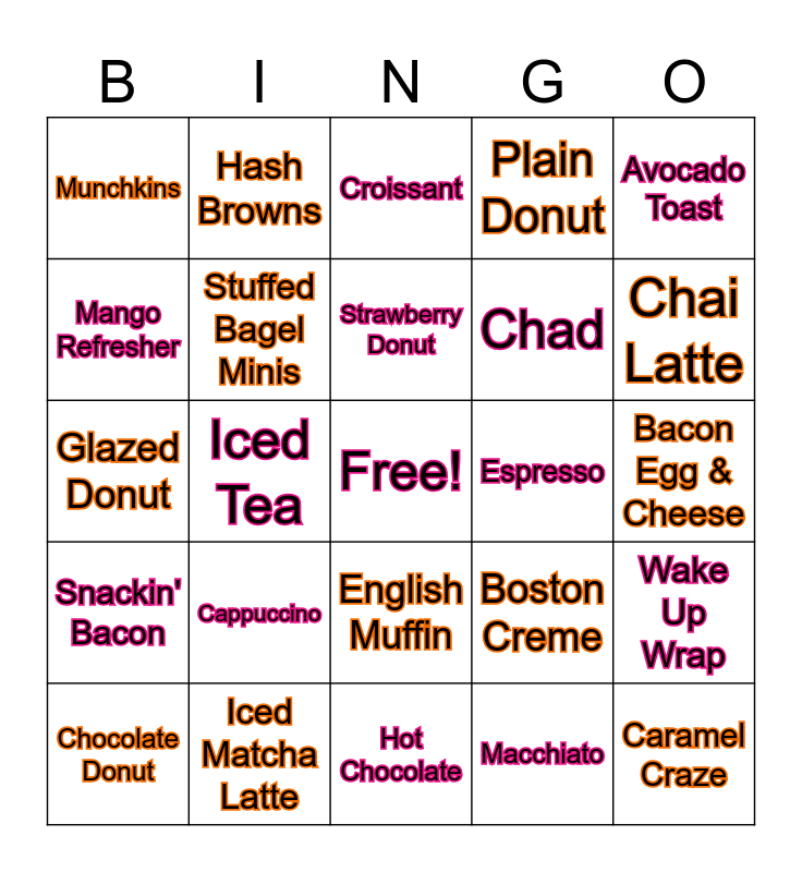 This bingo card has a free space and 24 words: Cappuccino, Iced Matcha Latte, Strawberry Donut, Chocolate Donut, Avocado Toast, Munchkins, Mango Refresher, Hash Browns, Espresso, English Muffin, Chad, Glazed Donut, Boston Creme, Wake Up Wrap, Stuffed Bagel Minis, Macchiato, Bacon Egg & Cheese, Croissant, Chai Latte, Iced Tea, Caramel Craze, Snackin' Bacon, Plain Donut and Hot Chocolate.