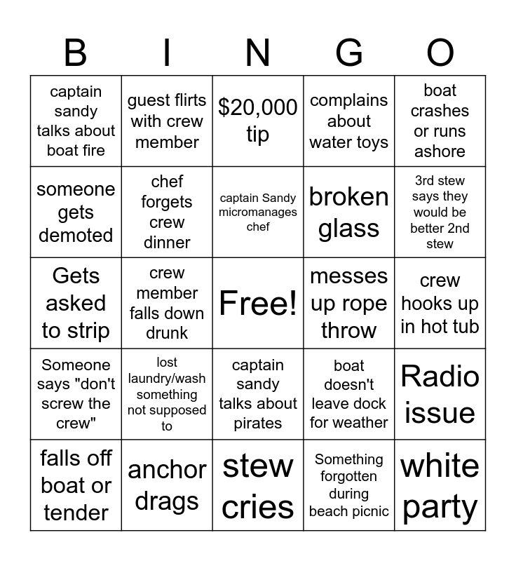 This bingo card has a free space and 28 words: Radio issue, Pizza seen in crew mess, broken glass, Something forgotten during beach picnic, someone gets demoted, $20,000 tip, guest flirts with crew member, Someone says "don't screw the crew", messes up rope throw, falls off boat or tender, Gets asked to strip, complains about water toys, anchor drags, stew cries, 3rd stew says they would be better 2nd stew, 2nd stew says they would be better chief stew, lost laundry/wash something not supposed to, chef forgets crew dinner, captain Sandy micromanages chef, captain sandy talks about pirates, captain sandy talks about boat fire, captain sandy talks about being a woman, white party, crew member falls down drunk, crew hooks up in hot tub, boat doesn't leave dock for weather, boat crashes or runs ashore and anchor gets tangled.