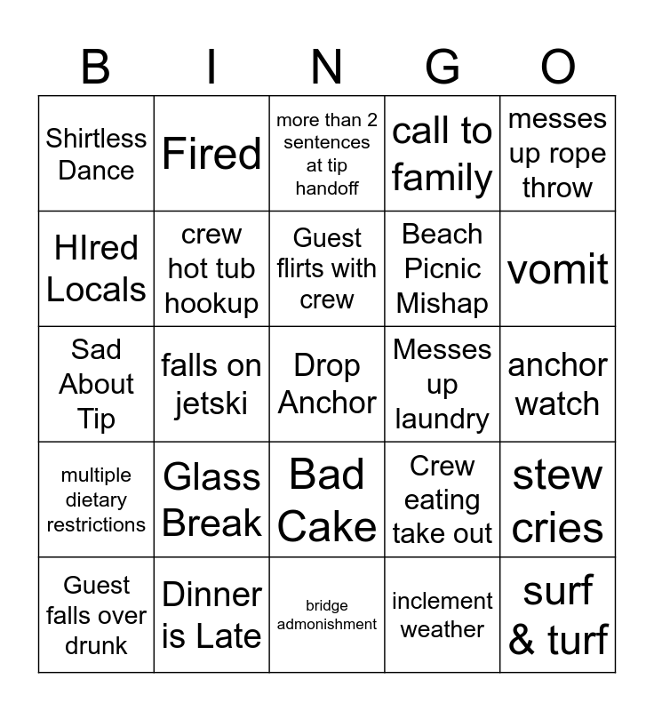 This bingo card has a free space and 24 words: Glass Break, Dinner is Late, Guest flirts with crew, Guest falls over drunk, messes up rope throw, Shirtless Dance, HIred Locals, Fired, Messes up laundry, Bad Cake, Beach Picnic Mishap, Sad About Tip, Crew eating take out, stew cries, crew hot tub hookup, inclement weather, anchor watch, more than 2 sentences at tip handoff, vomit, falls on jetski, surf & turf, multiple dietary restrictions, call to family and bridge admonishment.