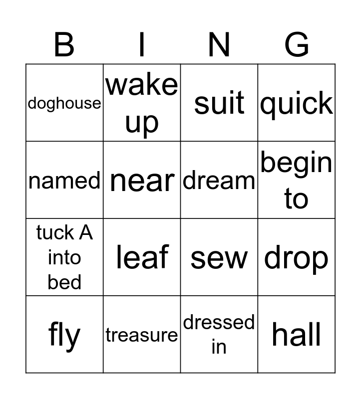 This bingo card has 25 words: except, grow up, begin to, nurse, named, doghouse, near, wake up, treasure, until, tuck A into bed, sew, fall asleep, strange, dream, blow open, dressed in, suit, leaf, drop, fly, scream, hall, quick and catch.
