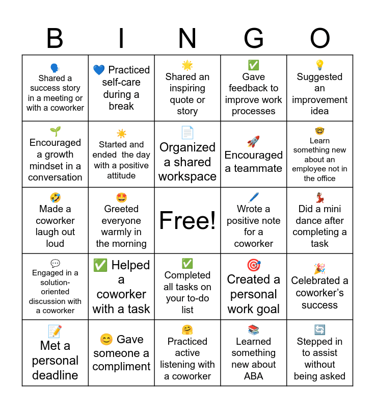 This bingo card has a free space and 24 words: β Helped a coworker with a task, π Gave someone a compliment, π Organized a shared workspace, π Met a personal deadline, π‘ Suggested an improvement idea, π£ Shared a success story in a meeting or with a coworker, π± Encouraged a growth mindset in a conversation, π Practiced self-care during a break, π Wrote a positive note for a coworker, β Completed all tasks on your to-do list, π Encouraged a teammate, π€£ Made a coworker laugh out loud, π― Created a personal work goal, π Celebrated a coworkerβs success, βοΈ Started and endedΒ the day with a positive attitude, π Learned something new about ABA, ππ½ Did a mini dance after completing a task, π Shared an inspiring quote or story, π€ Learn something new about an employee not in the office, π€© Greeted everyone warmly in the morning, π Stepped in to assist without being asked, π¬ Engaged in a solution-oriented discussion with a coworker, β Gave feedback to improve work processes and π€ Practiced active listening with a coworker.
