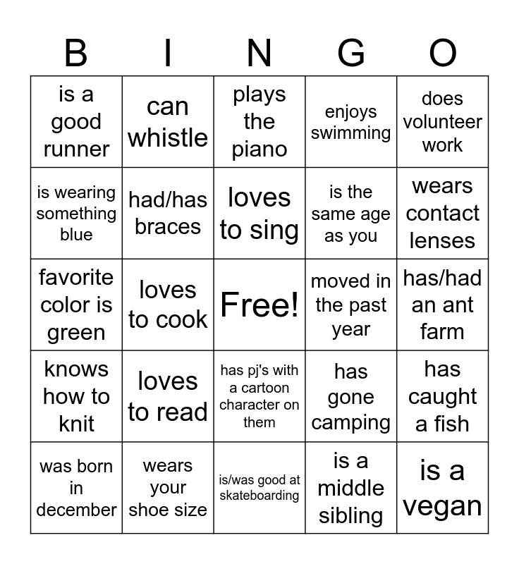 This bingo card has a free space and 53 words: has their nails painted, is a vegan, likes spicy food, is a middle sibling, loves to read, has a dog, can whistle, has a food allergy, is wearing something blue, has been to a concert, had/has braces, has a brother, has caught a fish, has gone camping, played a sport in school, was born in december, loves to sing, moved in the past year, plays guitar, does volunteer work, loves to cook, likes pineapple on pizza, is the same age as you, is a good runner, doesn't drink coffee, wears your shoe size, is bilingual, is left-handed, traveled overseas, wears contact lenses, is a morning person, is younger than you, has a tattoo, is an only child, once worked at a fast food restaurant, had/has a pet ferret, enjoys swimming, is/was good at skateboarding, plays the piano, has lived an a farm, favorite vegetable is carrots, was in marching band, has/had an ant farm, likes to eat pistashio nuts, has been sledding in the last 3 years, has pj's with a cartoon character on them, holds winning record of a video game, won a dance contest, favorite color is green, knows how to knit, pays bills online, has had a broken arm or leg and knows how to drive a stick shift.