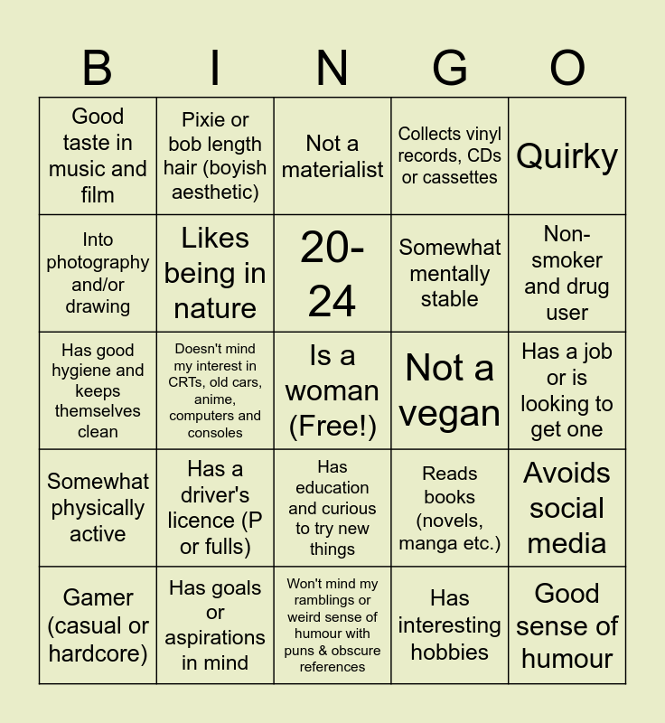 This bingo card has a free space and 24 words: Gamer (casual or hardcore), Has a driver's licence (P or fulls), 20-24, Has interesting hobbies, Quirky, Good taste in music and film, Pixie or bob length hair (boyish aesthetic), Not a materialist, Not a vegan, Has a job or is looking to get one, Has good hygiene and keeps themselves clean, Likes being in nature, Reads books (novels, manga etc.), Avoids social media, Into photography and/or drawing, Has goals or aspirations in mind, Won't mind my ramblings or weird sense of humour with puns & obscure references, Collects vinyl records, CDs or cassettes, Non-smoker and drug user, Somewhat physically active, Doesn't mind my interest in CRTs, old cars, anime, computers and consoles, Has education and curious to try new things, Somewhat mentally stable and Good sense of humour.