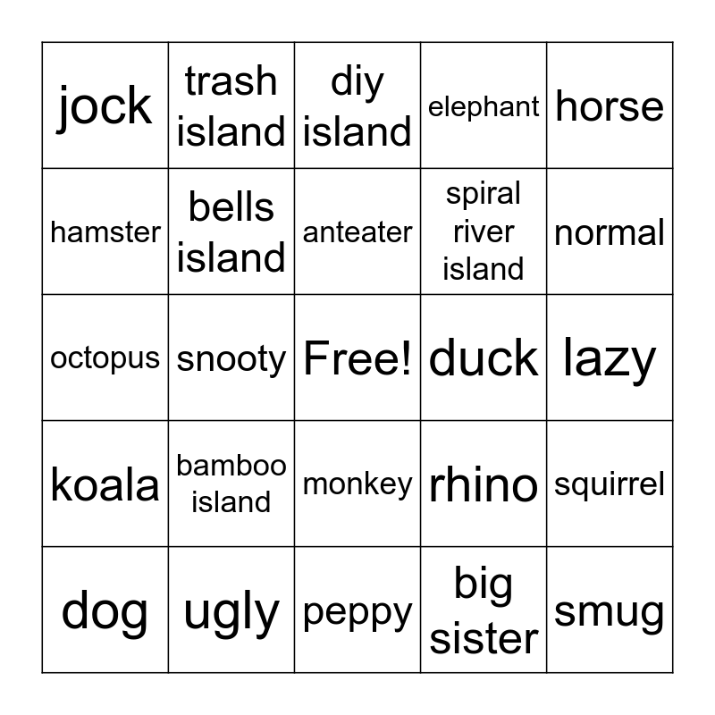 This bingo card has a free space and 29 words: dog, cat, snooty, cranky, jock, diy island, bells island, bamboo island, duck, ugly, lazy, smug, peppy, big sister, normal, mouse, monkey, koala, horse, octopus, rhino, tarantula island, spiral river island, hamster, elephant, trash island, squirrel, anteater and frog.