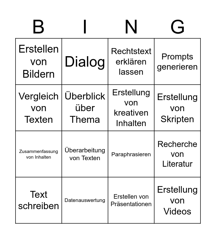 This bingo card has 16 words: Datenauswertung, Recherche von Literatur, Rechtstext erklären lassen, Erstellen von Bildern, Zusammenfassung von Inhalten, Dialog, Paraphrasieren, Erstellen von Präsentationen, Vergleich von Texten, Überblick über Thema, Text schreiben, Prompts generieren, Überarbeitung von Texten, Erstellung von Skripten, Erstellung von kreativen Inhalten and Erstellung von Videos.