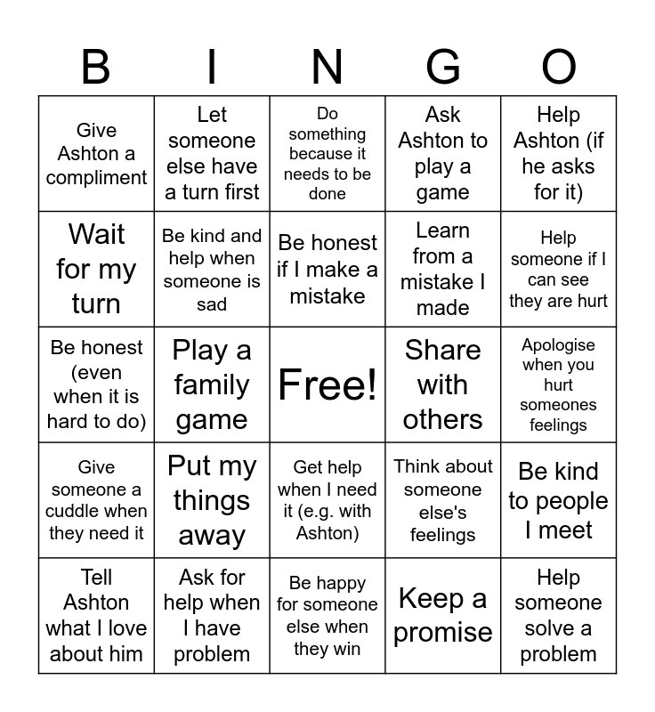 This bingo card has a free space and 24 words: Put my things away, Ask for help when I have problem, Be honest if I make a mistake, Tell Ashton what I love about him, Help Ashton (if he asks for it), Give Ashton a compliment, Wait for my turn, Let someone else have a turn first, Share with others, Get help when I need it (e.g. with Ashton), Learn from a mistake I made, Be honest (even when it is hard to do), Think about someone else's feelings, Be kind to people I meet, Be kind and help when someone is sad, Keep a promise, Apologise when you hurt someones feelings, Do something because it needs to be done, Help someone if I can see they are hurt, Play a family game, Help someone solve a problem, Give someone a cuddle when they need it, Ask Ashton to play a game and Be happy for someone else when they win.