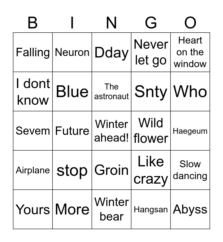 This bingo card has a free space and 24 words: stop, More, The astronaut, Yours, Heart on the window, Falling, I dont know, Neuron, Wild flower, Groin, Snty, Sevem, Like crazy, Slow dancing, Blue, Hangsan, Haegeum, Dday, Who, Future, Abyss, Airplane, Never let go and Winter bear.