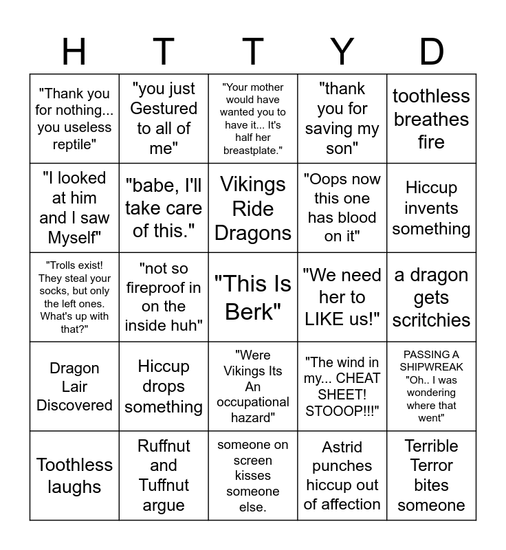 This bingo card has a free space and 24 words: Hiccup drops something, Ruffnut and Tuffnut argue, Vikings Ride Dragons, Toothless laughs, toothless breathes fire, "Thank you for nothing... you useless reptile", "I looked at him and I saw Myself", "you just Gestured to all of me", "We need her to LIKE us!", "Were Vikings Its An occupational hazard", "Oops now this one has blood on it", "Trolls exist! They steal your socks, but only the left ones. What's up with that?", "The wind in my... CHEAT SHEET! STOOOP!!!", PASSING A SHIPWREAK "Oh.. I was wondering where that went", "babe, I'll take care of this.", Astrid punches hiccup out of affection, a dragon gets scritchies, "Your mother would have wanted you to have it... It's half her breastplate.", Hiccup invents something, "not so fireproof in on the inside huh", Terrible Terror bites someone, Dragon Lair Discovered, "thank you for saving my son" and someone on screen kisses someone else..