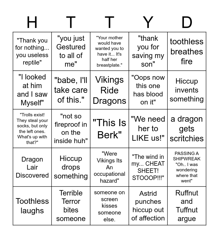 This bingo card has a free space and 24 words: Hiccup drops something, Terrible Terror bites someone, Vikings Ride Dragons, Toothless laughs, toothless breathes fire, "Thank you for nothing... you useless reptile", "I looked at him and I saw Myself", "you just Gestured to all of me", "We need her to LIKE us!", "Were Vikings Its An occupational hazard", "Oops now this one has blood on it", "Trolls exist! They steal your socks, but only the left ones. What's up with that?", "The wind in my... CHEAT SHEET! STOOOP!!!", PASSING A SHIPWREAK "Oh.. I was wondering where that went", "babe, I'll take care of this.", Astrid punches hiccup out of affection, a dragon gets scritchies, "Your mother would have wanted you to have it... It's half her breastplate.", Hiccup invents something, "not so fireproof in on the inside huh", Ruffnut and Tuffnut argue, Dragon Lair Discovered, "thank you for saving my son" and someone on screen kisses someone else..