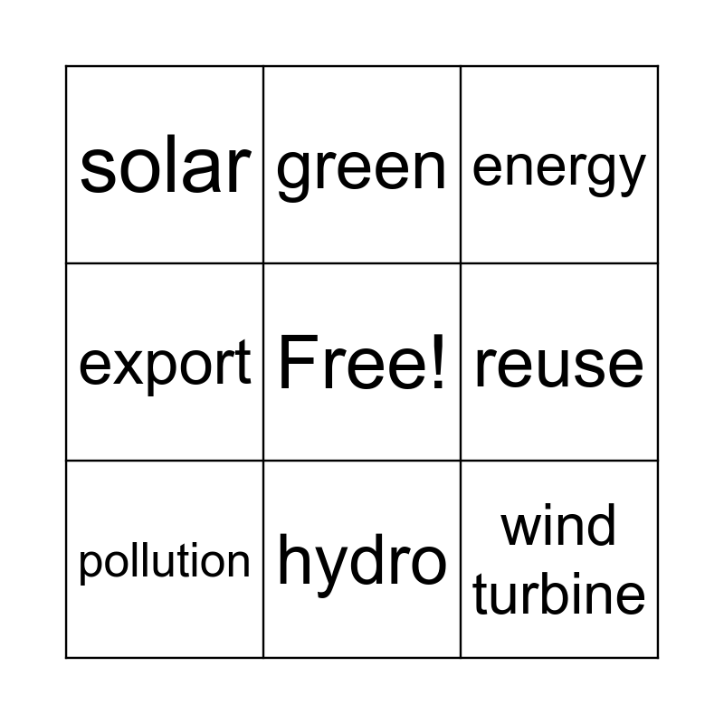 This bingo card has a free space and 15 words: sustainability, earth, energy, solar, hydro, wind turbine, carbon footprint, reduce, reuse, recycle, import, export, pollution, green and care.