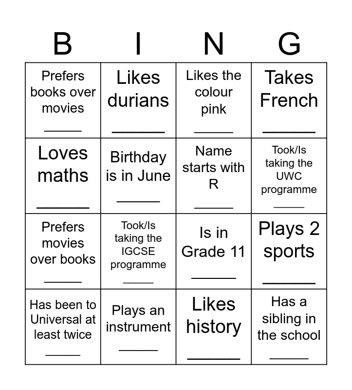 This bingo card has 16 words: Plays an instrument _____, Plays 2 sports _____, Likes the colour pink _____, Prefers books over movies _____, Prefers movies over books _____, Likes durians _____, Is in Grade 11 _____, Likes history _____, Loves maths _____, Birthday is in June _____, Has been to Universal at least twice _____, Takes French _____, Took/Is taking the IGCSE programme _____, Took/Is taking the UWC programme _____, Name starts with R _____ and Has a sibling in the school _____.