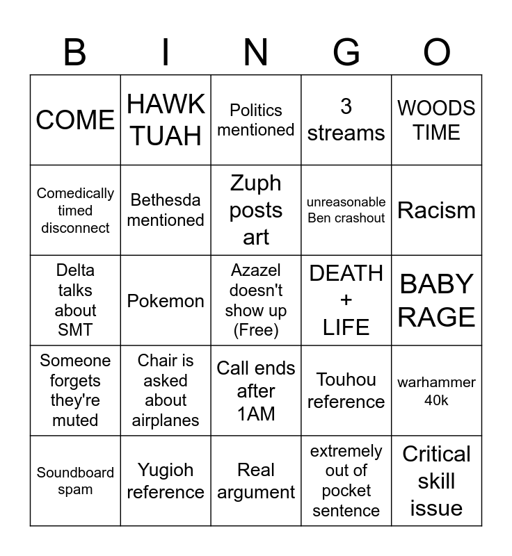 This bingo card has a free space and 24 words: Chair is asked about airplanes, Yugioh reference, Zuph posts art, Soundboard spam, WOODS TIME, COME, Comedically timed disconnect, HAWK TUAH, DEATH + LIFE, Call ends after 1AM, unreasonable Ben crashout, Delta talks about SMT, Touhou reference, warhammer 40k, Bethesda mentioned, extremely out of pocket sentence, BABY RAGE, Politics mentioned, Racism, Pokemon, Critical skill issue, Someone forgets they're muted, 3 streams and Real argument.