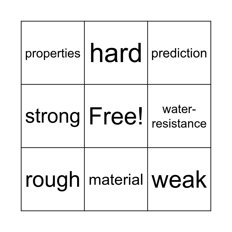 This bingo card has a free space and 13 words: flexible, smooth, rough, hard, strong, weak, rigid, waterproof, material, properties, water-resistance, prediction and object.