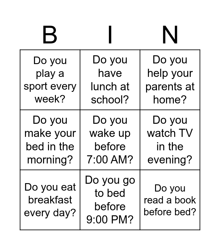 This bingo card has a free space and 13 words: Do you go to school by bus?, Do you brush your teeth twice a day?, Do you eat breakfast every day?, Do you have lunch at school?, Do you make your bed in the morning?, Do you read a book before bed?, Do you do your homework in the afternoon?, Do you play video games after school?, Do you go to bed before 9:00 PM?, Do you play a sport every week?, Do you watch TV in the evening?, Do you help your parents at home? and Do you walk to school?.