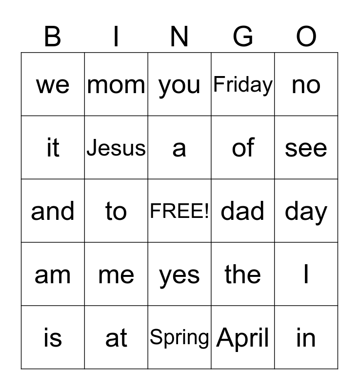 This bingo card has a free space and 24 words: me, at, a, is, no, we, it, mom, dad, yes, of, and, the, I, Jesus, April, day, you, see, to, in, am, Friday and Spring.