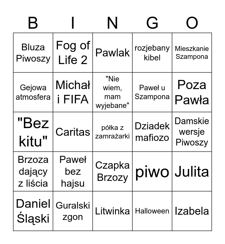 This bingo card has 25 words: Paweł bez hajsu, Litwinka, "Nie wiem, mam wyjebane", Daniel Śląski, Mieszkanie Szampona, Bluza Piwoszy, Gejowa atmosfera, Fog of Life 2, Dziadek mafiozo, Czapka Brzozy, Paweł u Szampona, "Bez kitu", piwo, Julita, Michał i FIFA, Izabela, Damskie wersje Piwoszy, Pawlak, Poza Pawła, Caritas, półka z zamrażarki, Guralski zgon, Brzoza dający z liścia, rozjebany kibel and Halloween.