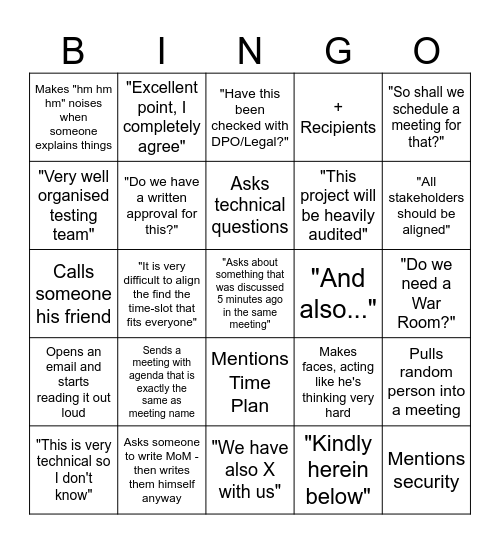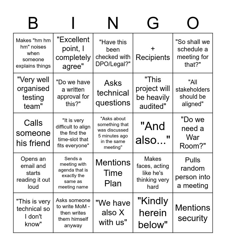 This bingo card has 25 words: Sends a meeting with agenda that is exactly the same as meeting name, "We have also X with us", Asks technical questions, "This is very technical so I don't know", "So shall we schedule a meeting for that?", Makes "hm hm hm" noises when someone explains things, "Very well organised testing team", "Excellent point, I completely agree", "And also...", Mentions Time Plan, "This project will be heavily audited", Calls someone his friend, Makes faces, acting like he's thinking very hard, Pulls random person into a meeting, "Do we have a written approval for this?", Mentions security, "Do we need a War Room?", "Have this been checked with DPO/Legal?", "All stakeholders should be aligned", "It is very difficult to align the find the time-slot that fits everyone", "Asks about something that was discussed 5 minutes ago in the same meeting", Asks someone to write MoM - then writes them himself anyway, Opens an email and starts reading it out loud, + Recipients and "Kindly herein below".
