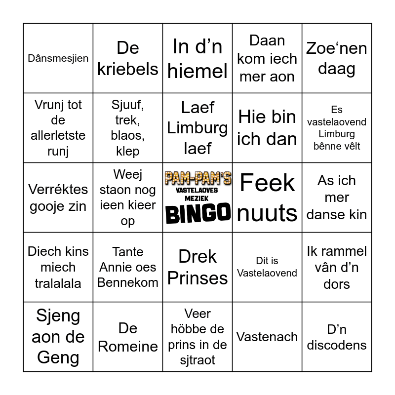 This bingo card has a free space and 35 words: Vastelaovend is…, De Nach is nog zoe laank, Groete oet de fieëstent, Sjuuf, trek, blaos, klep, Drek Prinses, Daan kom iech mer aon, Vrunj tot de allerletste runj, Lurrie, Laef Limburg laef, Roetewisser, Verréktes gooje zin, Zoe‘nen daag, Bla bla bla, Kepotmakereej, Dânsmesjien, Feek nuuts, Vastenach, Weej staon nog ieen kieer op, Diech kins miech tralalala, D’n discodens, Dit is Vastelaovend, Sjeng aon de Geng, Ik rammel vân d’n dors, De Romeine, In d’n hiemel, Es vastelaovend Limburg bênne vêlt, Gekke minse, Es de lempkes zweije, Hie bin ich dan, As ich mer danse kin, Uhhhhh, Veer höbbe de prins in de sjtraot, Tante Annie oes Bennekom, De kriebels and Twieëmaol aafgezeëg.