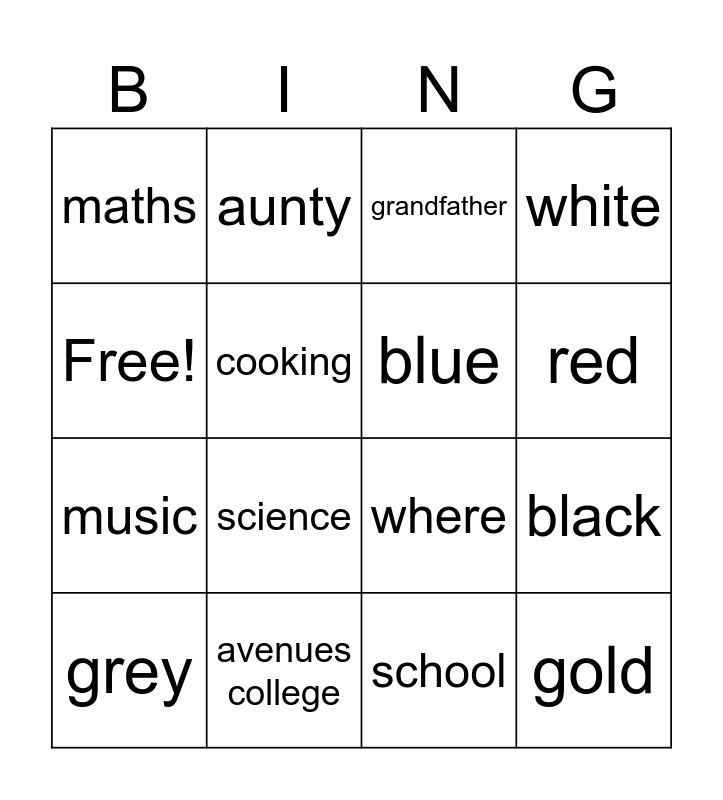 This bingo card has 39 words: pink, purple, green, blue, orange, yellow, red, silver, Free!, gold, black, white, grey, school, avenues college, auslan, english, maths, tech, PE, cooking, art, music, science, mum, dad, brother, sister, cousin, aunty, uncle, grandmother, grandfather, carer, who, what, when, where and why.