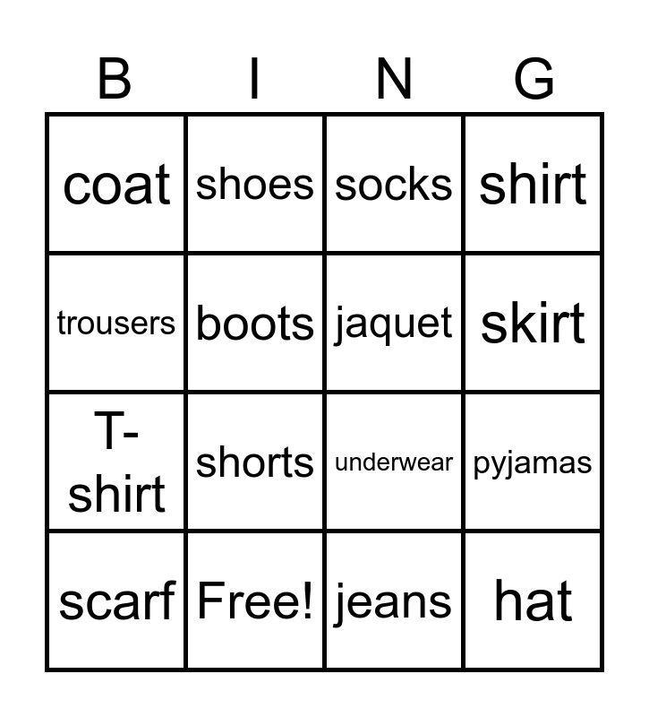 This bingo card has 21 words: Free!, dress, shoes, pullover, jeans, jaquet, coat, socks, underwear, skirt, T-shirt, shirt, hat, cap, boots, gloves, scarf, shorts, trousers, pyjamas and blouse.
