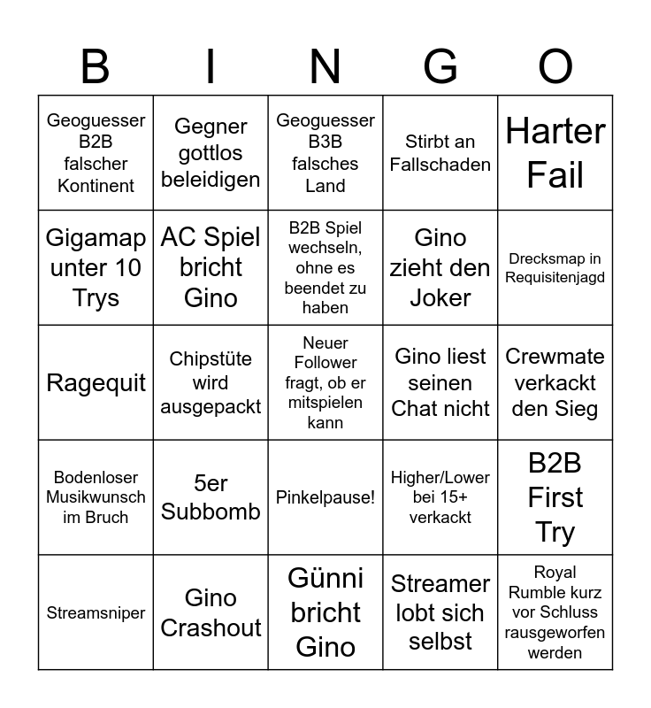 This bingo card has 25 words: 5er Subbomb, Günni bricht Gino, B2B Spiel wechseln, ohne es beendet zu haben, Streamsniper, Harter Fail, Geoguesser B2B falscher Kontinent, Gigamap unter 10 Trys, Gegner gottlos beleidigen, Gino liest seinen Chat nicht, Pinkelpause!, Gino zieht den Joker, Ragequit, Higher/Lower bei 15+ verkackt, B2B First Try, AC Spiel bricht Gino, Royal Rumble kurz vor Schluss rausgeworfen werden, Crewmate verkackt den Sieg, Geoguesser B3B falsches Land, Drecksmap in Requisitenjagd, Chipstüte wird ausgepackt, Neuer Follower fragt, ob er mitspielen kann, Gino Crashout, Bodenloser Musikwunsch im Bruch, Stirbt an Fallschaden and Streamer lobt sich selbst.