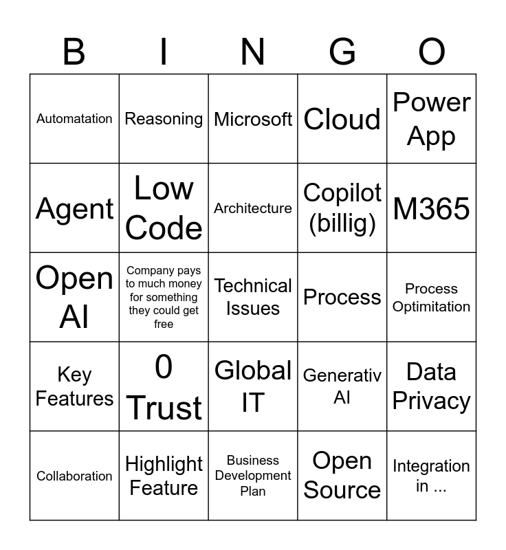 This bingo card has 25 words: 0 Trust, Business Development Plan, Architecture, Collaboration, Power App, Automatation, Agent, Reasoning, Process, Global IT, Copilot (billig), Open AI, Generativ AI, Data Privacy, Low Code, Integration in ..., Process Optimitation, Microsoft, M365, Company pays to much money for something they could get free, Technical Issues, Highlight Feature, Key Features, Cloud and Open Source.