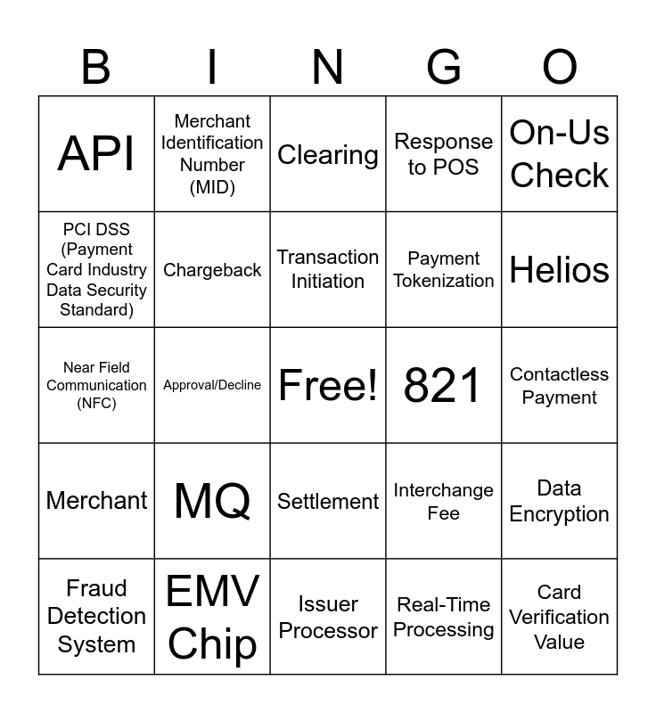 This bingo card has a free space and 36 words: Acquirer, Issuer, Authorization, Chargeback, Interchange Fee, Merchant, Transaction Initiation, Authorization Request, On-Us Check, Internal Processing, Approval/Decline, Response to POS, PRIME, 821, Helios, API, Architect, MQ, Card Verification Value, Clearing, Contactless Payment, Data Encryption, EMV Chip, Fraud Detection System, Issuer Processor, Merchant Identification Number (MID), Near Field Communication (NFC), Payment Gateway, Payment Tokenization, PCI DSS (Payment Card Industry Data Security Standard), PIN (Personal Identification Number), Point of Sale (POS) Terminal, Real-Time Processing, Settlement, Tokenization and Transaction Routing.