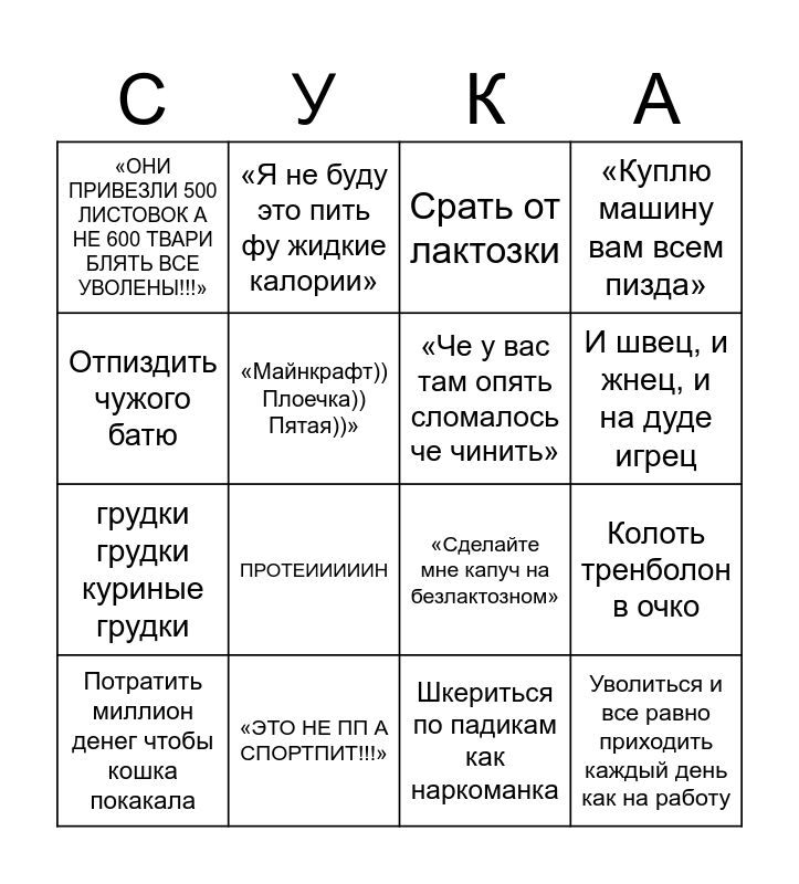This bingo card has 16 words: «ЭТО НЕ ПП А СПОРТПИТ!!!», Колоть тренболон в очко, Срать от лактозки, «ОНИ ПРИВЕЗЛИ 500 ЛИСТОВОК А НЕ 600 ТВАРИ БЛЯТЬ ВСЕ УВОЛЕНЫ!!!», грудки грудки куриные грудки, «Я не буду это пить фу жидкие калории», «Сделайте мне капуч на безлактозном», Шкериться по падикам как наркоманка, Отпиздить чужого батю, «Майнкрафт)) Плоечка)) Пятая))», Потратить миллион денег чтобы кошка покакала, «Куплю машину вам всем пизда», ПРОТЕИИИИИН, И швец, и жнец, и на дуде игрец, «Че у вас там опять сломалось че чинить» and Уволиться и все равно приходить каждый день как на работу.