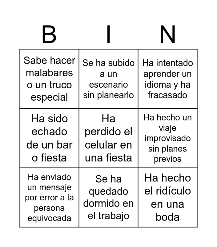 This bingo card has 25 words: Ha viajado a más de 10 países, Ha tenido una cita por una app, Se ha quedado dormido en el trabajo, Ha sido DJ o puesto música en una fiesta, Ha perdido el celular en una fiesta, Sabe hacer malabares o un truco especial, Ha hecho un viaje improvisado sin planes previos, Se ha subido a un escenario sin planearlo, Ha chocado el coche alguna vez, Ha vivido en otro país, Ha hecho el ridículo en una boda, Ha ganado un premio o concurso, Ha dormido en el aeropuerto, Se ha quedado sin batería en el peor momento, Ha enviado un mensaje por error a la persona equivocada, Ha comido algo raro o exótico, Ha hecho una broma pesada, Ha intentado aprender un idioma y ha fracasado, Ha olvidado el nombre de alguien justo después de conocerlo, Se ha caído en público de forma épica, Ha trabajado en algo que nadie en la fiesta imaginaría, Ha conocido a un famoso, Ha pedido matrimonio o se lo han pedido, Ha sido echado de un bar o fiesta and Se ha cambiado el color de pelo radicalmente.