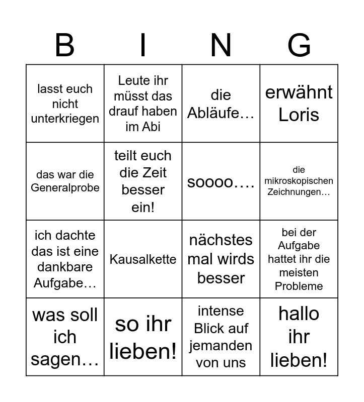 This bingo card has 16 words: so ihr lieben!, bei der Aufgabe hattet ihr die meisten Probleme, die Abläufe…, lasst euch nicht unterkriegen, ich dachte das ist eine dankbare Aufgabe…, Leute ihr müsst das drauf haben im Abi, nächstes mal wirds besser, intense Blick auf jemanden von uns, das war die Generalprobe, teilt euch die Zeit besser ein!, was soll ich sagen…, erwähnt Loris, Kausalkette, die mikroskopischen Zeichnungen…, soooo…. and hallo ihr lieben!.