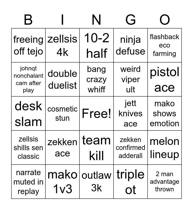 This bingo card has a free space and 24 words: zekken ace, mako 1v3, bang crazy whiff, narrate muted in replay, flashback eco farming, freeing off tejo, johnqt nonchalant cam after play, zellsis 4k, jett knives ace, team kill, weird viper ult, desk slam, zekken confirmed adderall, melon lineup, double duelist, triple ot, mako shows emotion, 10-2 half, pistol ace, cosmetic stun, 2 man advantage thrown, zellsis shills sen classic, ninja defuse and outlaw 3k.