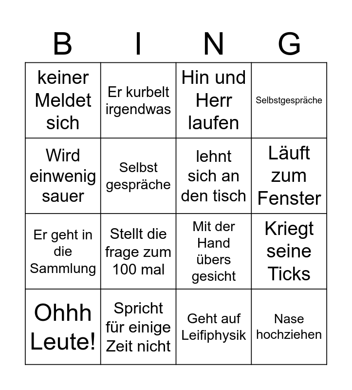 This bingo card has 20 words: Kriegt seine Ticks, Guckt auf sein Handy, Hin und Herr laufen, Mund Geräusche, Ohhh Leute!, Wird einwenig sauer, Spricht für einige Zeit nicht, keiner Meldet sich, Er geht in die Sammlung, Er kurbelt irgendwas, Stellt die frage zum 100 mal, Mit der Hand übers gesicht, Selbst gespräche, Nase hochziehen, lehnt sich an den tisch, Anwesenheit checken, Läuft zum Fenster, Selbstgespräche, Geht auf Leifiphysik and läuft einmal durch die Klasse.
