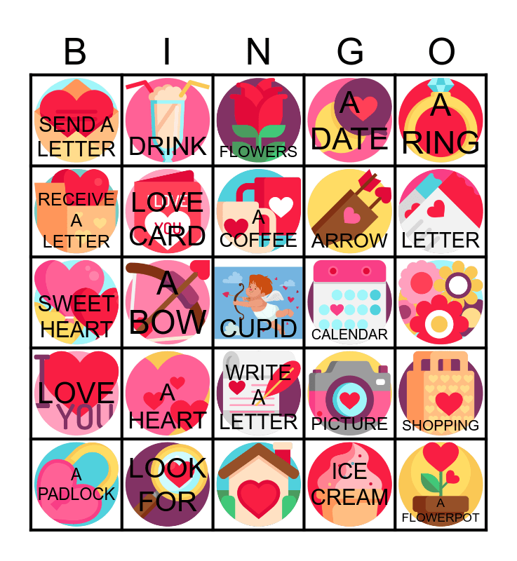 This bingo card has 24 images, a free space and 22 words: A HEART, LOOK FOR, A COFFEE, A PADLOCK, A RING, SEND A LETTER, RECEIVE A LETTER, DRINK, CALENDAR, WRITE A LETTER, ARROW, SWEET HEART, PICTURE, SHOPPING, LOVE CARD, ICE CREAM, FLOWERS, LETTER, A BOW, A FLOWERPOT, LOVE and A DATE.