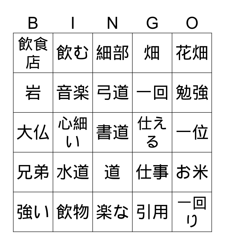This bingo card has a free space and 29 words: 強い, 引く, 心細い, 仏, 飲食店, 細部, 音楽, 水道, 仕える, 飲物, 一位, 一回り, 楽な, 引用, 勉強, 岩石, 道, 兄弟, 花畑, 大仏, 仕事, 弱点, 一回, 岩, 畑, 飲む, お米, 弓道 and 父母.