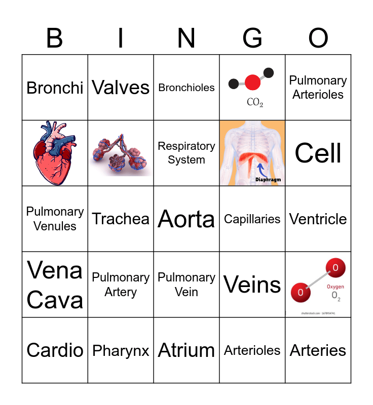 This bingo card has 6 images and 24 words: Pharynx, Larynx, Trachea, Epiglottis, Bronchi, Bronchioles, Pulmonary Vein, Capillaries, Atrium, Ventricle, Aorta, Arterioles, Arteries, Cell, Venules, Veins, Vena Cava, Pulmonary Artery, Pulmonary Arterioles, Pulmonary Venules, Valves, Cardio, Respiratory System and Circulatory System.