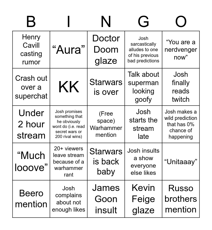 This bingo card has a free space and 24 words: 20+ viewers leave stream because of a warhammer rant, Josh complains about not enough likes, Starwars is over, Beero mention, “You are a nerdvenger now”, Henry Cavill casting rumor, Crash out over a superchat, “Aura”, Josh starts the stream late, Starwars is back baby, Talk about superman looking goofy, Under 2 hour stream, Josh insults a show everyone else likes, “Unitaaay”, KK, Kevin Feige glaze, Josh makes a wild prediction that has 0% chance of happening, Doctor Doom glaze, Josh finally reads twitch, Josh promises something that he obviously wont do (i.e. read secret wars or 200 rival wins), Russo brothers mention, “Much looove”, Josh sarcastically alludes to one of his previous bad predictions and James Goon insult.