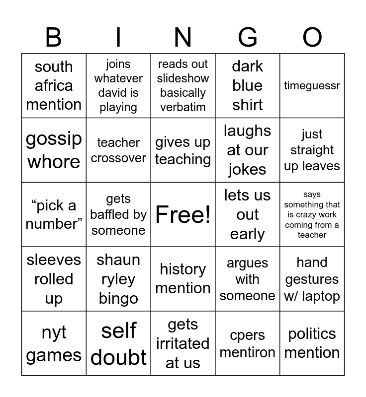 This bingo card has a free space and 25 words: shaun ryley bingo, gets irritated at us, gives up teaching, nyt games, timeguessr, south africa mention, gossip whore, joins whatever david is playing, lets us out early, history mention, laughs at our jokes, “pick a number”, argues with someone, hand gestures w/ laptop, teacher crossover, passive aggressive, says something that is crazy work coming from a teacher, reads out slideshow basically verbatim, just straight up leaves, gets baffled by someone, politics mention, self doubt, sleeves rolled up, dark blue shirt and cpers mentiron.