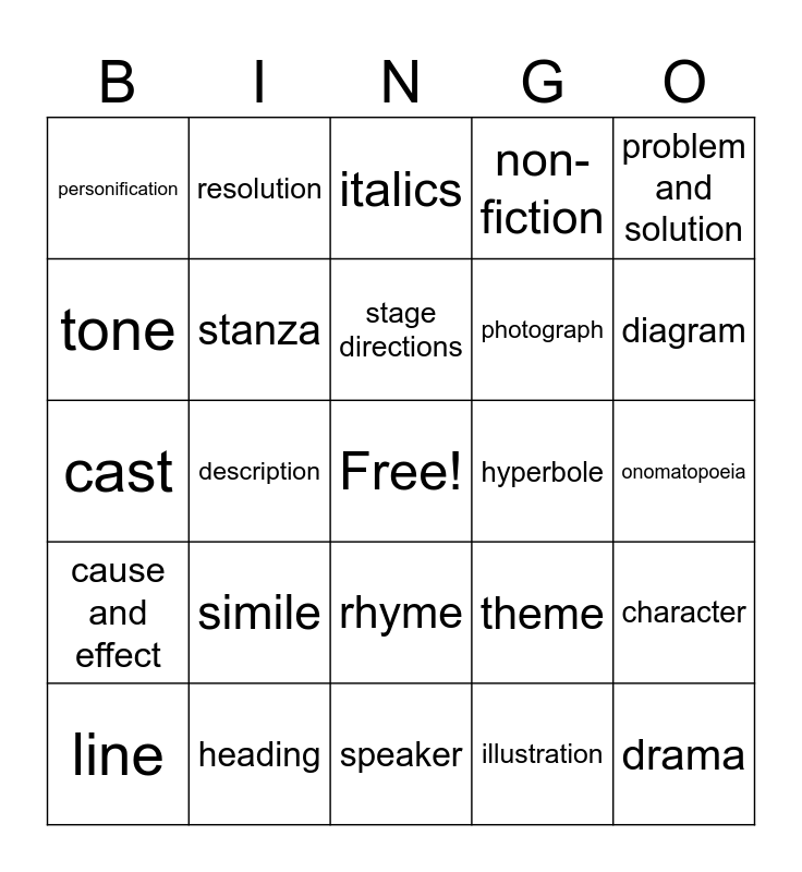 This bingo card has a free space and 39 words: drama, script, poet, stanza, line, rhyme, stage directions, captions, problem and solution, cause and effect, description, non-fiction, drama, onomatopoeia, hyperbole, simile, metaphor, personification, author's purpose, theme, tone, speaker, photograph, diagram, playwright, climax, plot, falling action, rising action, resolution, text evidence, dialogue, italics, heading, illustration, chronological order, character, cast and prop.