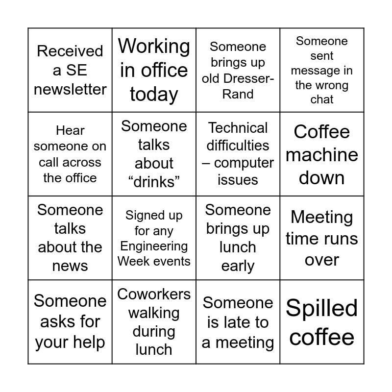 This bingo card has 40 words: Someone mentions weather, Someone brings up lunch early, Back-to-back meetings, Technical difficulties – computer issues, Someone talks about weekend plans, Someone asks for a “quick meeting” – quick teams call, Coffee machine down, Someone using the printer, Hear someone on call across the office, Spilled coffee, Meeting time runs over, Someone sent message in the wrong chat, Someone asks for your help, Someone is late to a meeting, Coworkers walking during lunch, I spy a Glenn cutout, Spot someone with funny/colorful socks, Received a SE newsletter, Someone mentions the Bills, Someone brings up old Dresser-Rand, “HR wouldn’t like that very much”, See Dennis walking around the office, Someone talks about the news, Someone talks about “drinks”, Someone leaves snacks at their cubicle, Someone using their stand-up desk, Someone using the concession area in cafeteria, In person conference room meeting, “Is it Friday yet?”, Someone brings up going home, There’s a line for coffee, Spot someone on their phone, Someone sends you a gif/funny image, Someone brings up USA vs Canada hockey game, Signed up for any Engineering Week events, Someone accidentally plays video out loud, Have a meeting scheduled today, Working remote today, Working in office today and An unattended computer that isn’t locked.