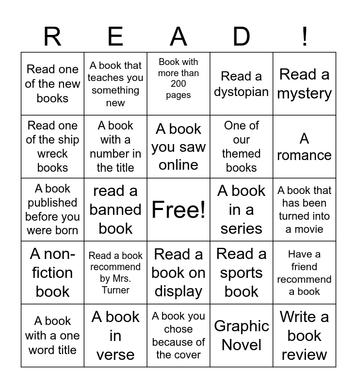 This bingo card has a free space and 24 words: Read a book recommend by Mrs. Turner, A book in verse, A book you saw online, A book with a one word title, Read a mystery, Read one of the new books, Read one of the ship wreck books, A book that teaches you something new, A book in a series, Read a book on display, One of our themed books, A book published before you were born, Read a sports book, Have a friend recommend a book, A book with a number in the title, Graphic Novel, A book that has been turned into a movie, Book with more than 200 pages, A romance, read a banned book, Write a book review, A non-fiction book, Read a dystopian and A book you chose because of the cover.