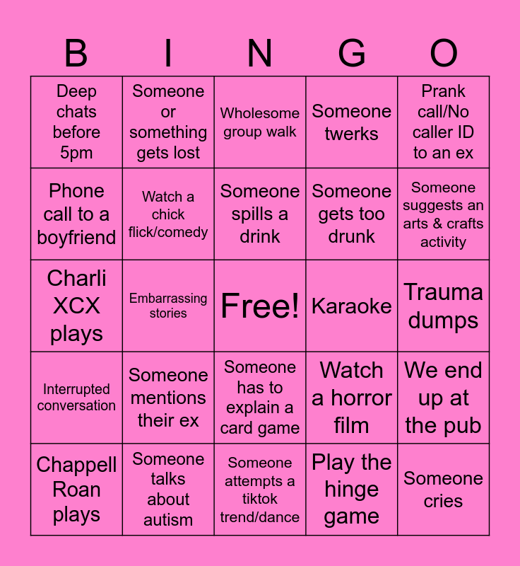 This bingo card has a free space and 24 words: Someone mentions their ex, Someone talks about autism, Someone spills a drink, Chappell Roan plays, Prank call/No caller ID to an ex, Deep chats before 5pm, Phone call to a boyfriend, Someone or something gets lost, Karaoke, Someone has to explain a card game, Someone gets too drunk, Charli XCX plays, Watch a horror film, We end up at the pub, Watch a chick flick/comedy, Play the hinge game, Trauma dumps, Wholesome group walk, Someone suggests an arts & crafts activity, Embarrassing stories, Someone cries, Interrupted conversation, Someone twerks and Someone attempts a tiktok trend/dance.