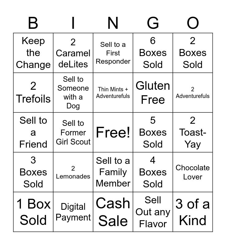 This bingo card has a free space and 29 words: 1 Box Sold, 2 Thin Mints, Sell to Former Girl Scout, 2 Boxes Donated, Keep the Change, Sell to a First Responder, Sell to Someone with a Dog, 2 Lemonades, 5 Boxes Sold, Digital Payment, 2 Toast-Yay, 3 of a Kind, Cash Sale, Sell Out any Flavor, 2 Adventurefuls, Peanut Butter Lover, Sell to a Family Member, 3 Boxes Sold, 2 Boxes Sold, Sell to a Friend, 4 Boxes Sold, 3 Boxes Donated, Gluten Free, 2 Trefoils, 6 Boxes Sold, 2 Caramel deLites, Chocolate Lover, Thin Mints + Adventurefuls and 4 of a Kind.