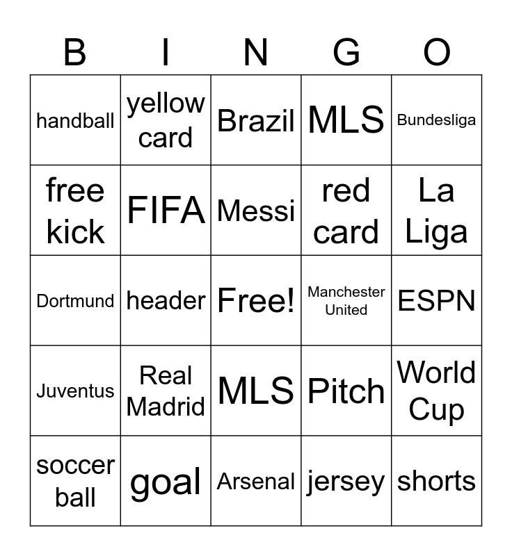 This bingo card has a free space and 24 words: Real Madrid, goal, Messi, soccer ball, Bundesliga, handball, free kick, yellow card, Manchester United, MLS, red card, Dortmund, Pitch, World Cup, FIFA, jersey, ESPN, Brazil, La Liga, header, shorts, Juventus, MLS and Arsenal.